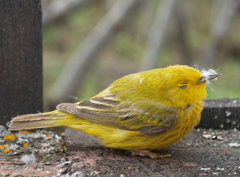 Yellow Warbler (Dendroica petechia), one of the smaller songbirds common here in the Atlin summer. This one got lost inside our cabin and was exhausted flying against the window to get out again. But it recovered and flew away once I put it outside and I took the picture.