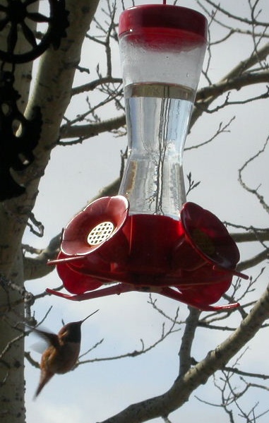 Rufous Hummingbird (Selasphorus rufus): the only hummingbird that comes this far north and breeds in this area. Generally the last week of April they dance around the spot where the feeder was last year but by the beginning of August they are gone again. It is the only bird that can hoover and can fly backwards, Their aerial antics are a delight to observe.