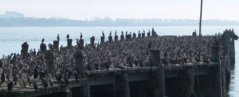 Oamaru: the old wharf, now home to part of the Oamaru (mostly) Pied Shag population that must be numbering in the tens of thousands.