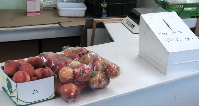Fruit verkoop langs de weg: de kartonnen doos is de kassa: "Betaal hier. Dank u wel"