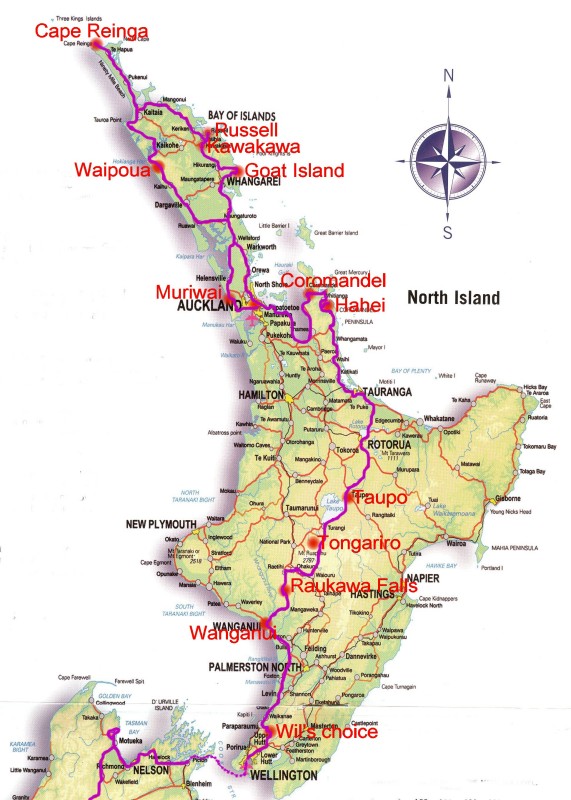In Purple: our itinerary on the North Island; we flew into Auckland, went up North along the W.Coast, came then South along the E.Coast and then through the centre to Wellington to take the ferry to the South Island. The red name tags are the places of which there are some pictures on the North Island page.