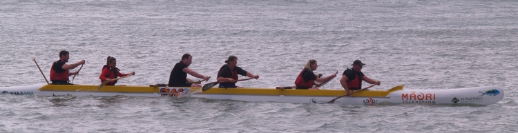 De "whaka" peddelaars in hun boot met een soort drijver (aan de andere kant). Deze manier van kano-ing op de oceaan is erg in. We zagen het ook op de Cook Eilanden. Deze boten komen in solo, twee, vier en zes personen formaten. Gedurende ons verblijf in Kaiteriteri waren er voor 2 dagen bijna konstant wedstrijden, die allemaal vanuit de bay de zee opgingen. De boten verdwenen soms helemaal in de golfdalen.