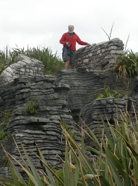 Hein amidst the Pancake Rocks. The finely bedded nature of the limestones is well visible.