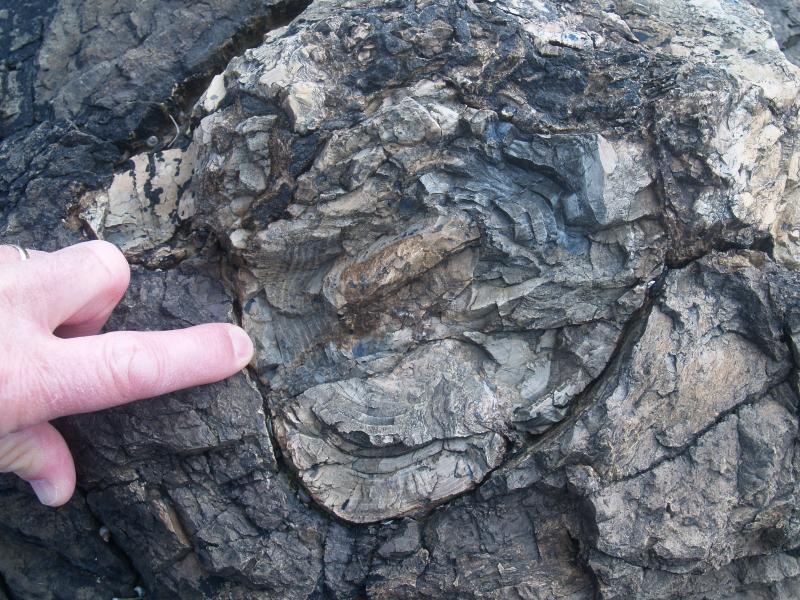 Curio Bay: Fossiel Bos, een van de weinige Jurassische fossiele bossen. Dit is een close up van een van de stronken; de jaarringen zijn goed zichtbaar.