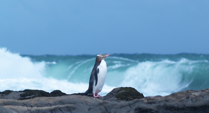 Curio Bay : Fossil Forest, While we were admiring the fossils, a Yellow-Eyed Penguin surfed in on top of the rocks. This is also the site of a colony of these solitary, timid and wary penguins. They go out by themselves to sea and come back by themselves, usually later in the day. They nest in smaller colonies. Actually this is the world's rarest penguin. (Megadyptes antipodes)