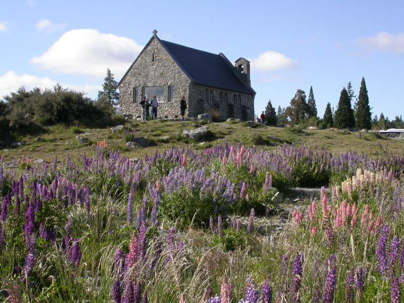 Lake Tekapo: Church of the Good Shepherd on the lake shore overlooking the lake and the mountains.