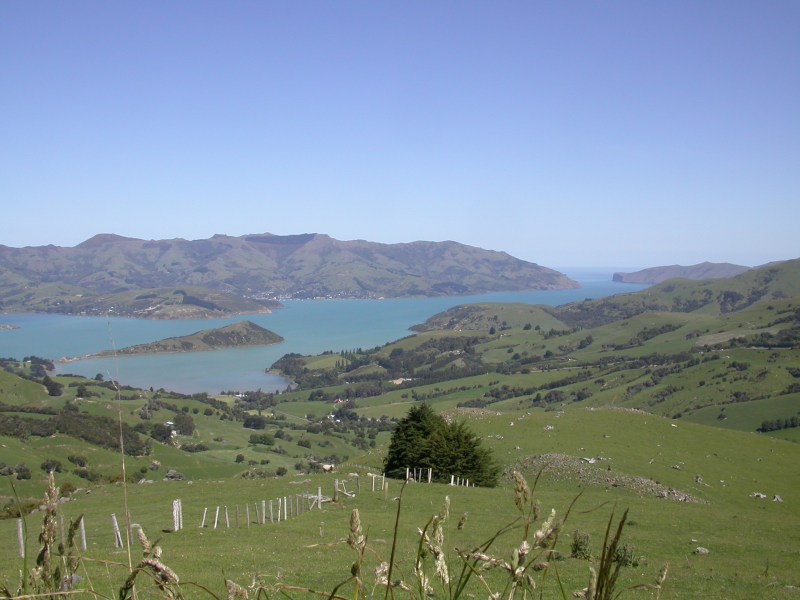 Akaroa : View of the collapsed caldera with the centre little dome. Akaroa is situated across the bay in the centre of the picture.